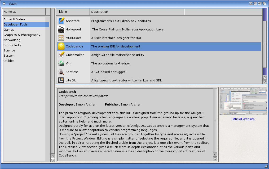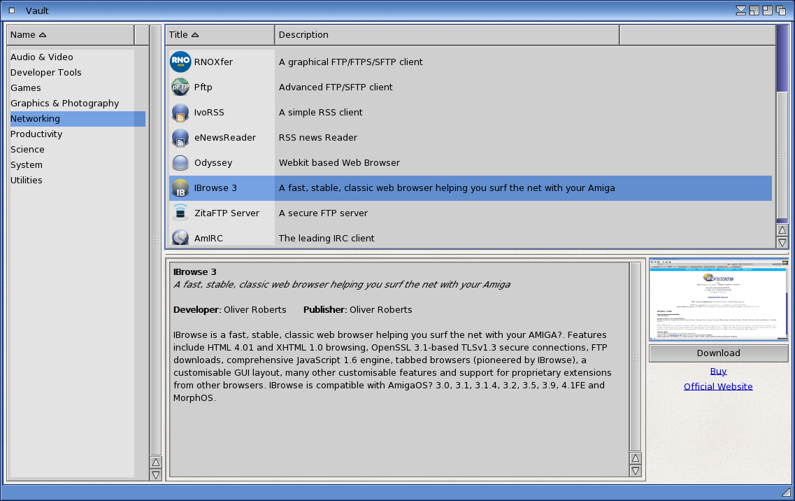 Vault is a tool that could be used by anyone to find software to run on AmigaOS 4. There are nine different categories, and clicking on each one of them, a list of application is presented. Selecting an application, more information appear at the bottom half of the window, including an extensive description, the developers and distributors, a small screenshot and a list of links to follow using their browser.